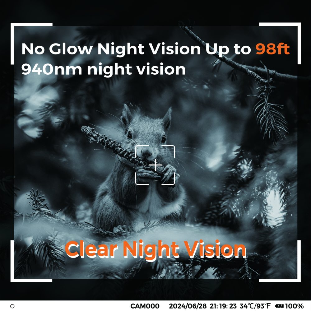 Kamera je opremljena fiksnim fokusom i snažnim IR LED diodama, koje omogućavaju snimanje u potpunom mraku bez narušavanja prirodnog ambijenta. PIR senzor dometa do 25 metara automatski aktivira snimanje pri detekciji pokreta, čineći ovu kameru pouzdanim alatom za praćenje kretanja u prirodi ili oko imanja.